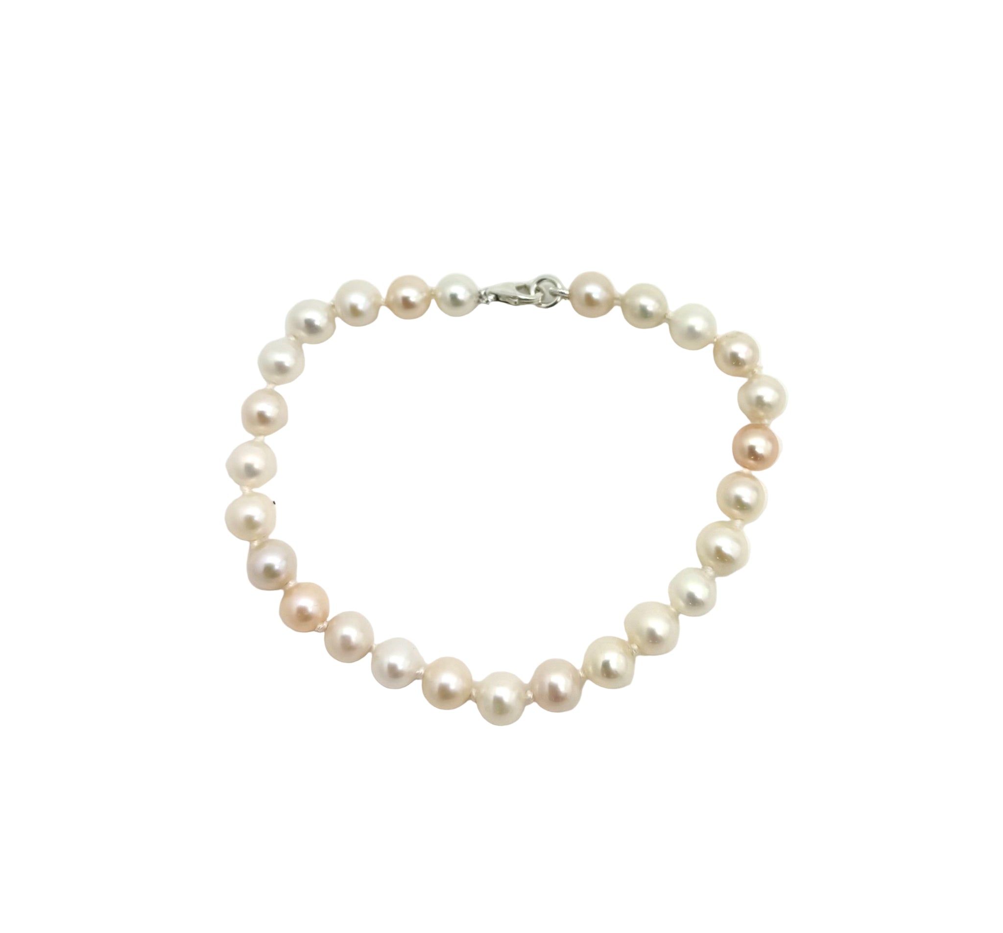 A pretty cultured freshwater pearl bracelet with pastel shades of white, pale cream and pale pink. These pearls measure approximately 6mm are are strung fully knotted with a silver clasp. The bracelet measures approximately 7.5" or 19cms in length.