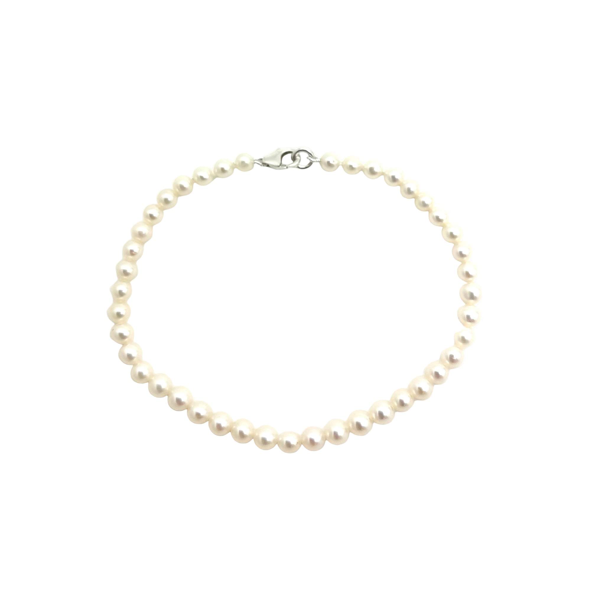 Classic cultured white freshwater pearl bracelet with a silver clasp. These pearls measure 3mm-4mm, and the bracelet is approximately 7cms or 17.5cms in length.