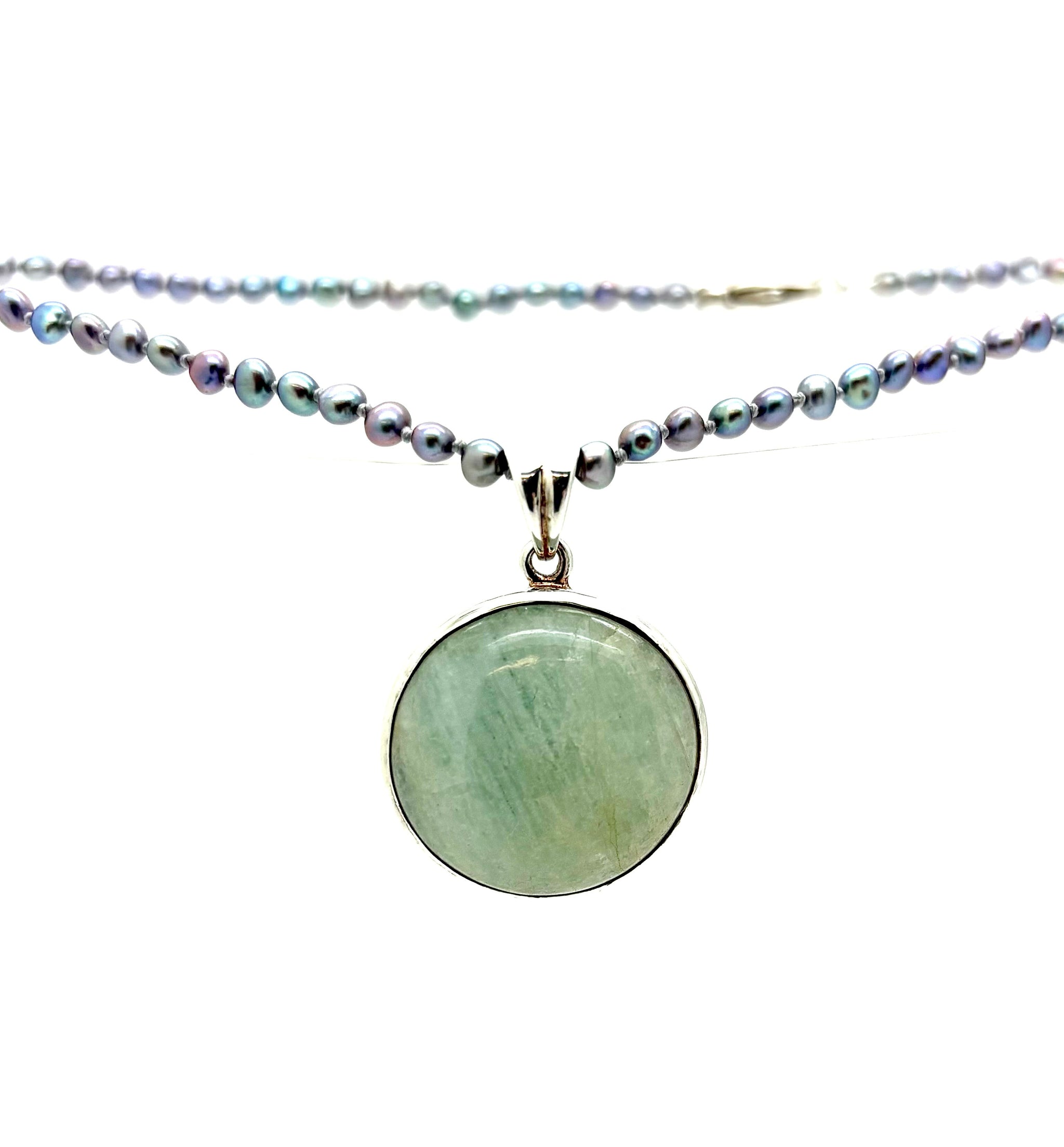 A beautiful necklace with small cultured freshwater peacock pearls with an aquamarine pendant set in silver. The pendant measures approximately 2.7cms in diameter, and the necklace measures 20" or 51cms in length.