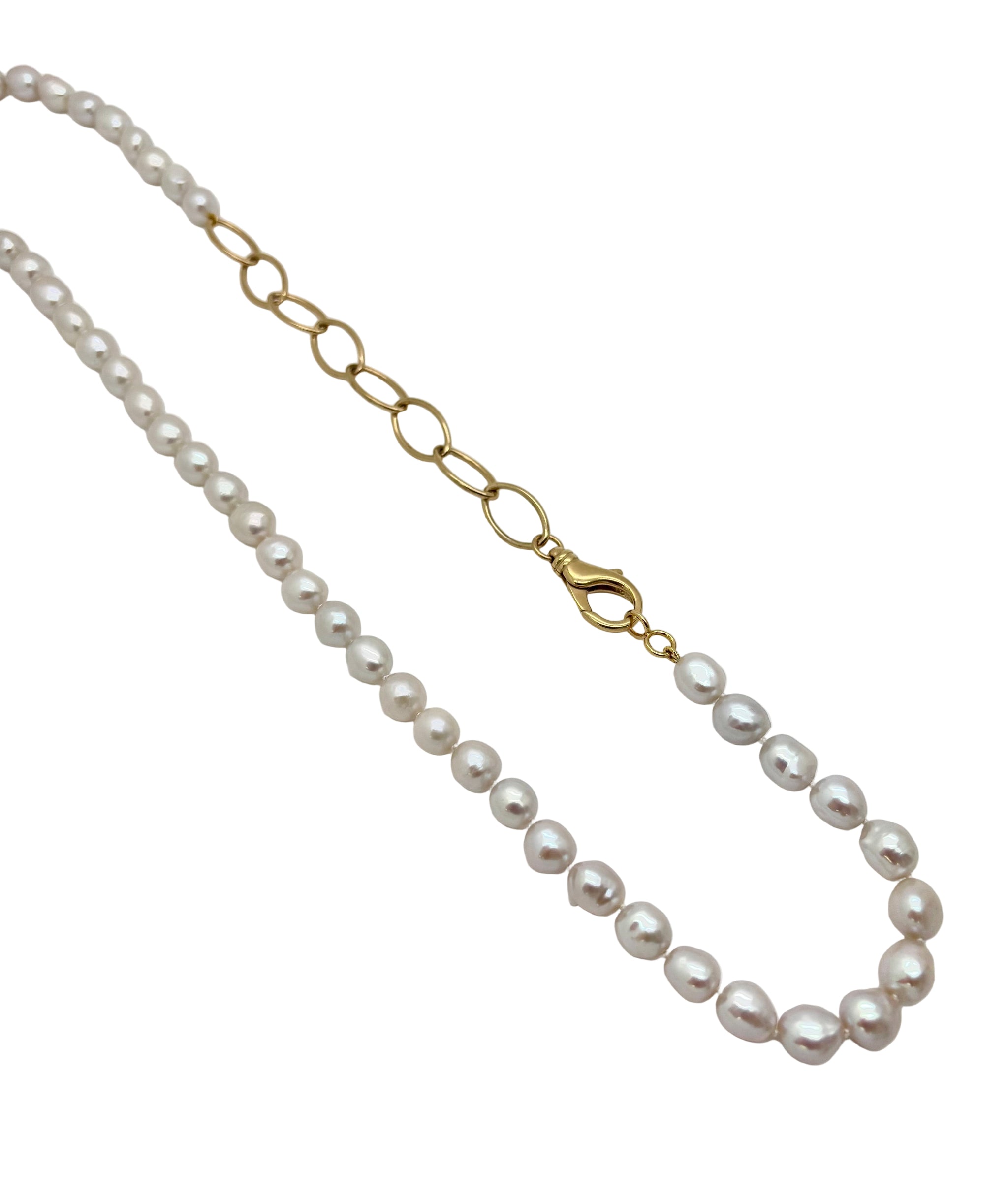 A beautiful smooth, semi-baroque cultured pearl necklace, white pearls with dove overtones, strung fully knotted with a gold plated silver chain and feature clasp.