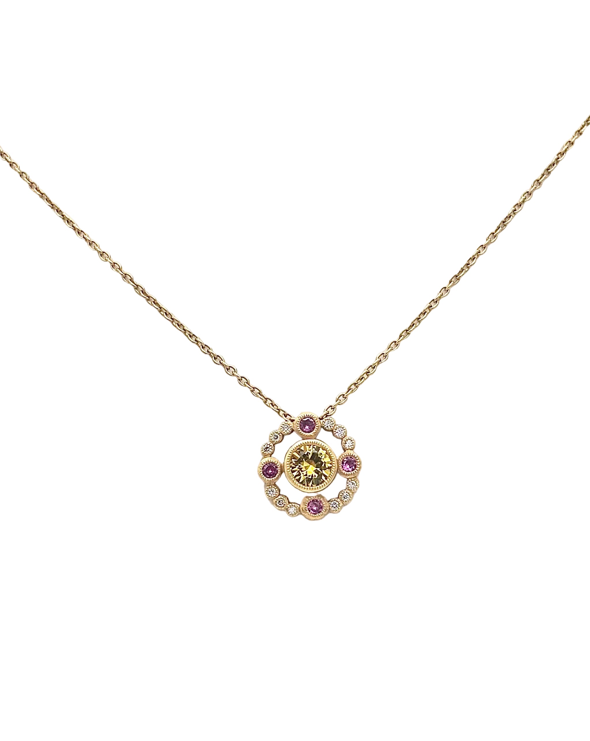 Extremely pretty yellow sapphire and Pink tourmaline and diamond pendant set in 18k yellow gold on long adjustable 20-22" 18k yellow gold chain.